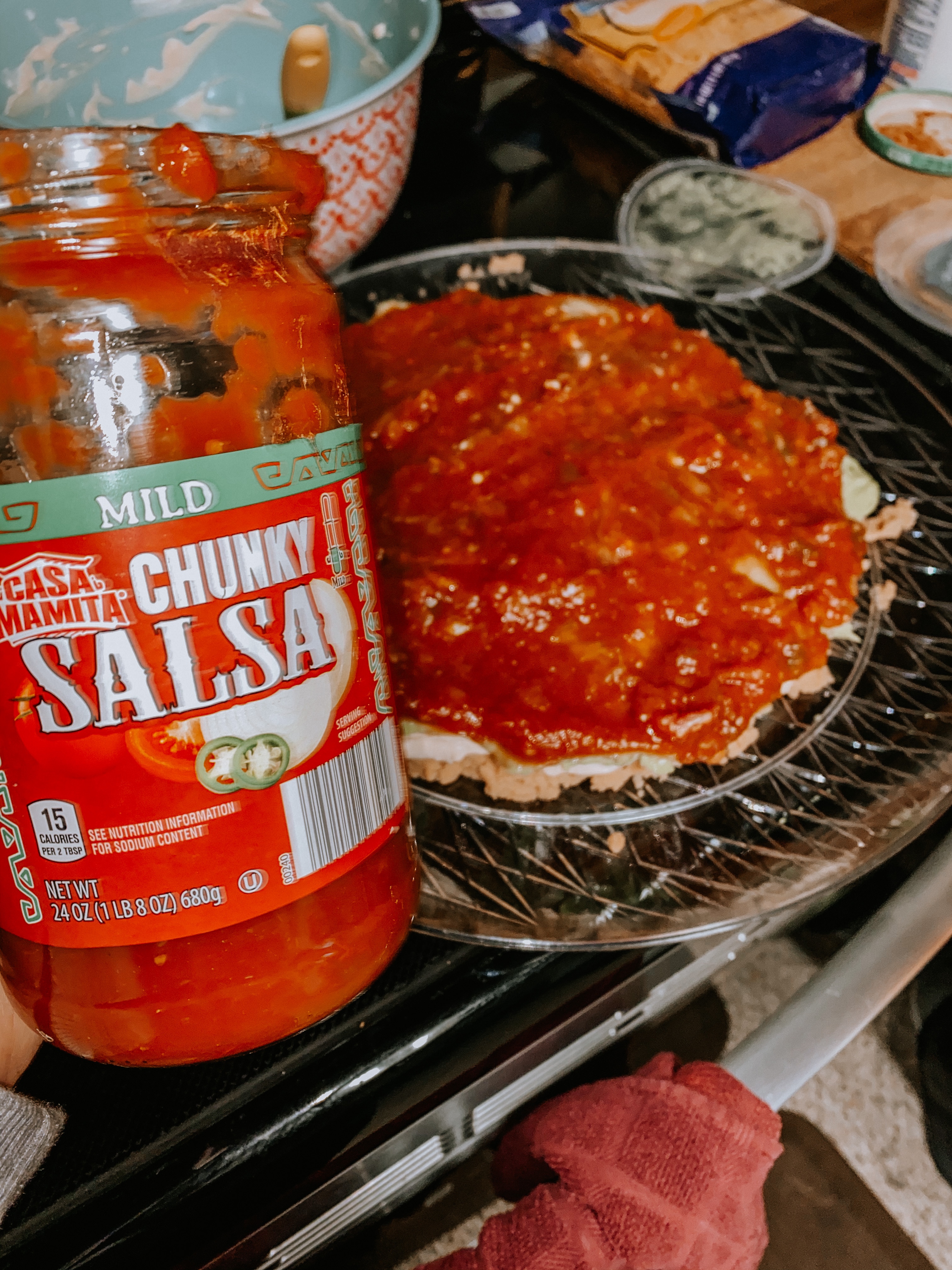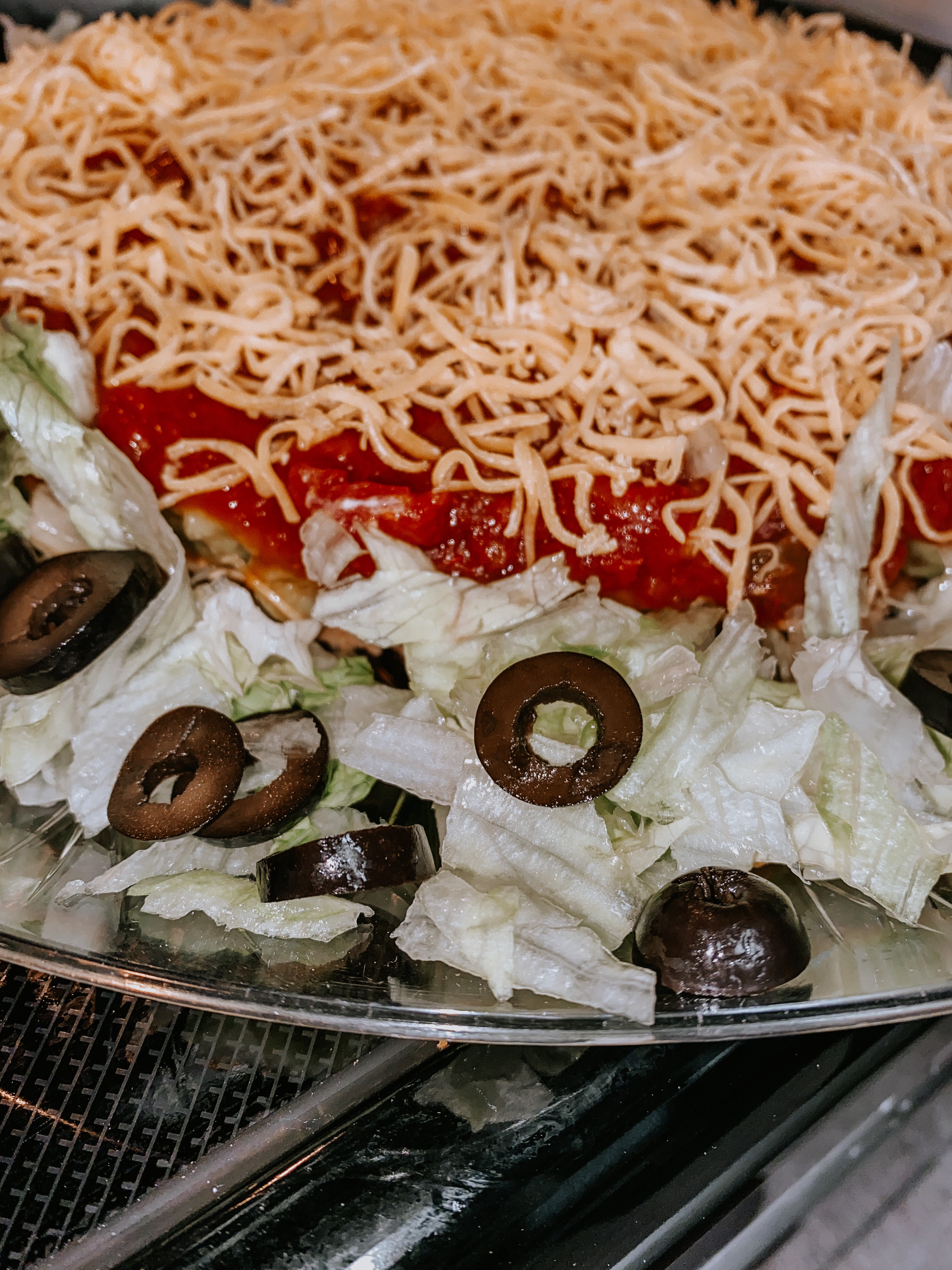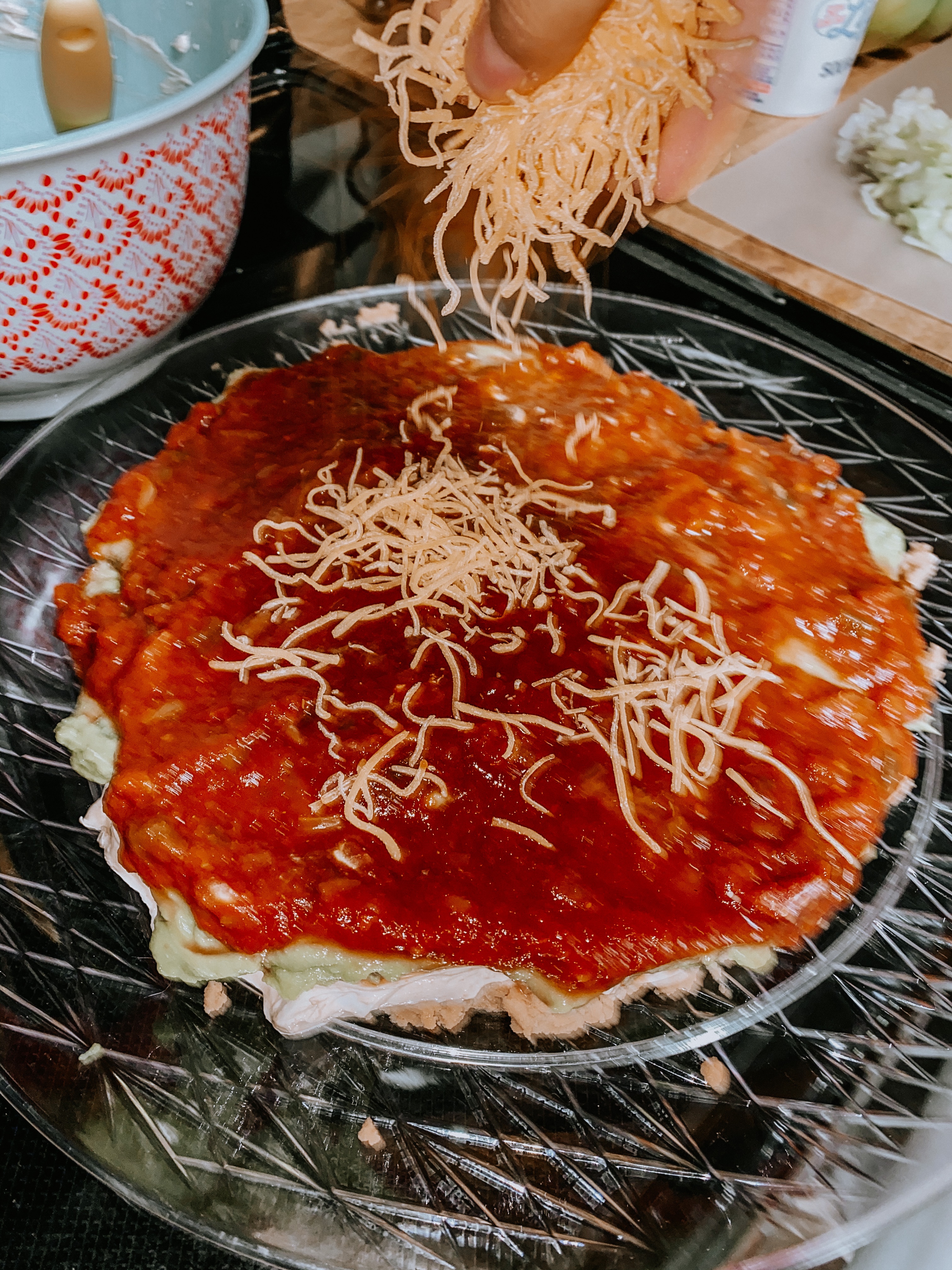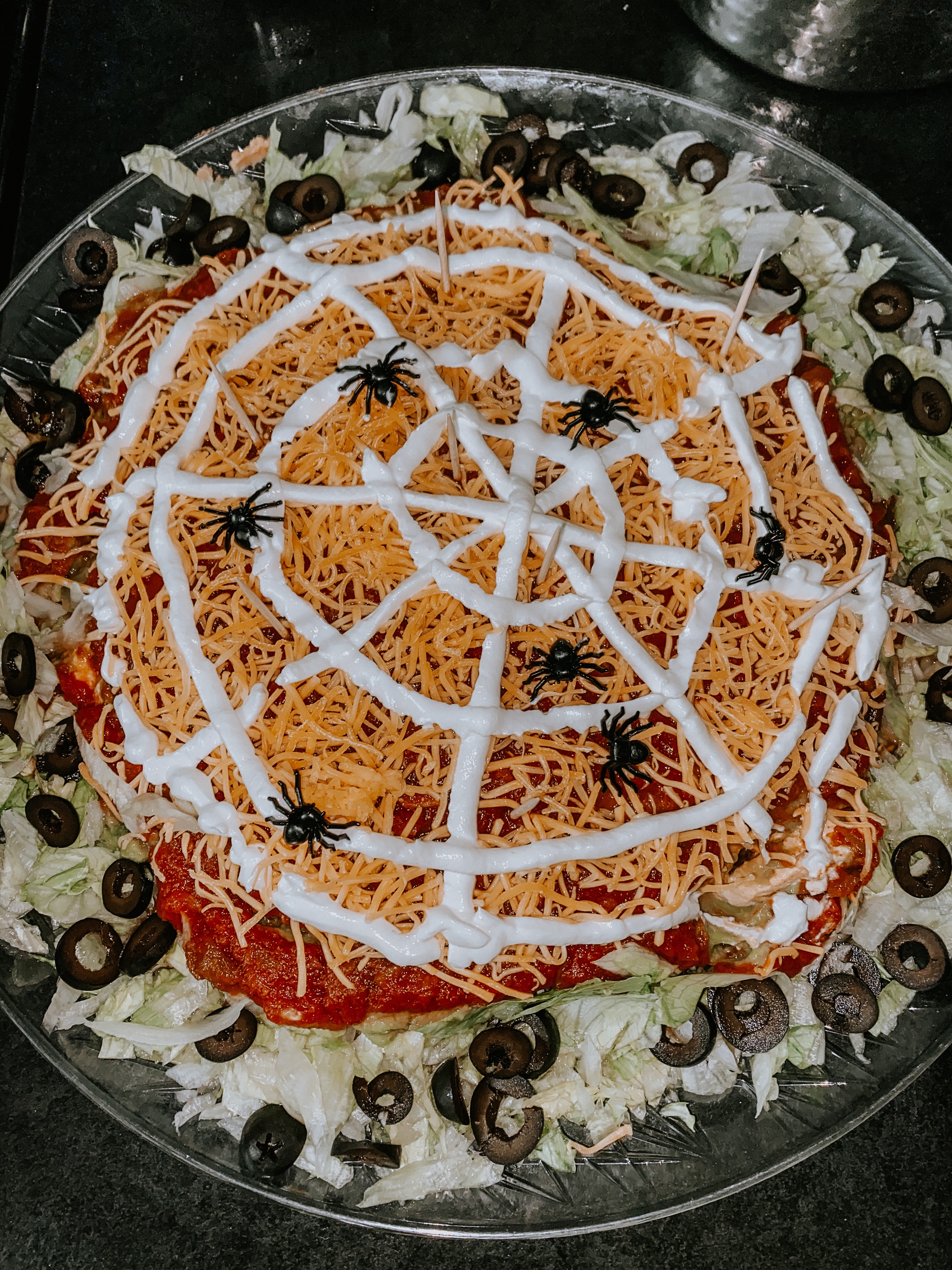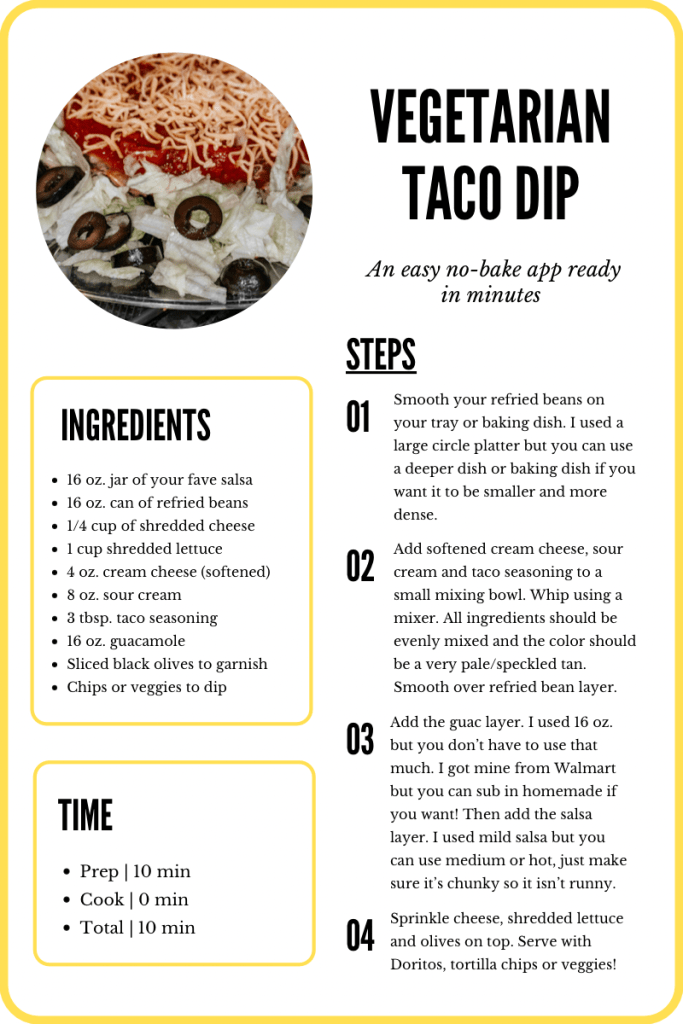 A crowd fave, TACO DIP! This vegetarian friendly taco dip will be a hit at your next gathering. It is served cold and can be whipped up in minutes! I put a fun twist on mine for Halloween last weekend, but this dip won’t fail no matter the time of year. Recipe card at the bottom!