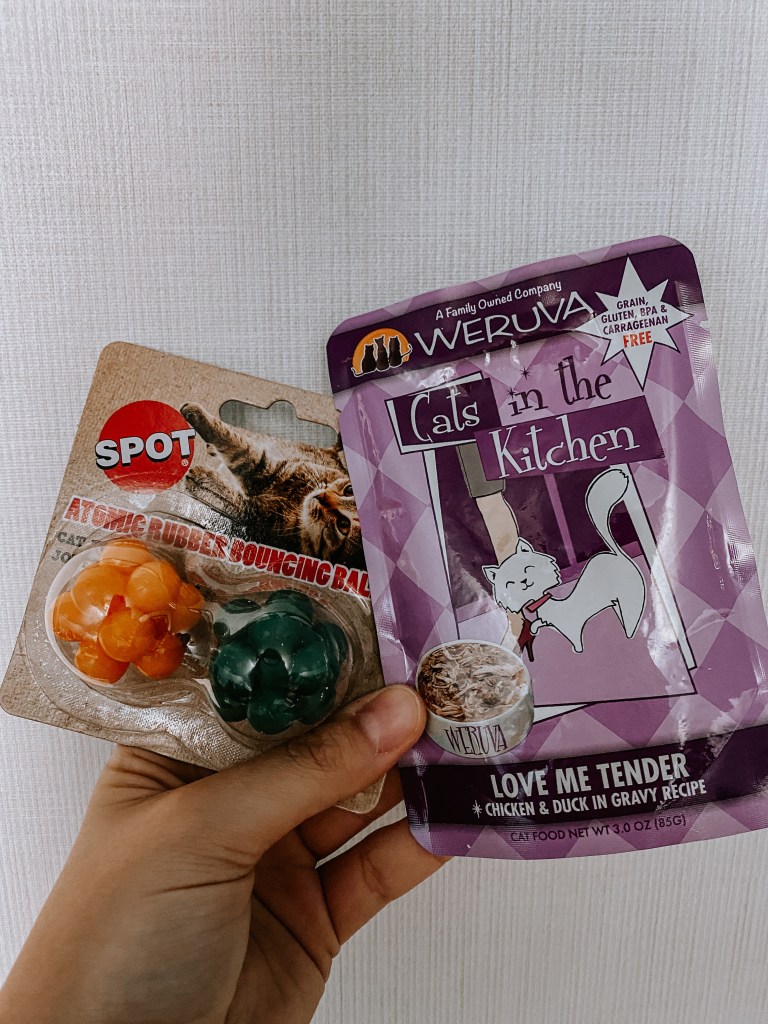 At this point we are 3 stickers deep and the first reward level is 5 stickers. We headed to Lawrenceville Pet Supply for some gifts for our little friends. My friend and I are both cat owners so we scoped out that section. I got my kitty, Coco two bouncy balls with spikes and a little pouch of food because he loves those liquid pouch mixes.