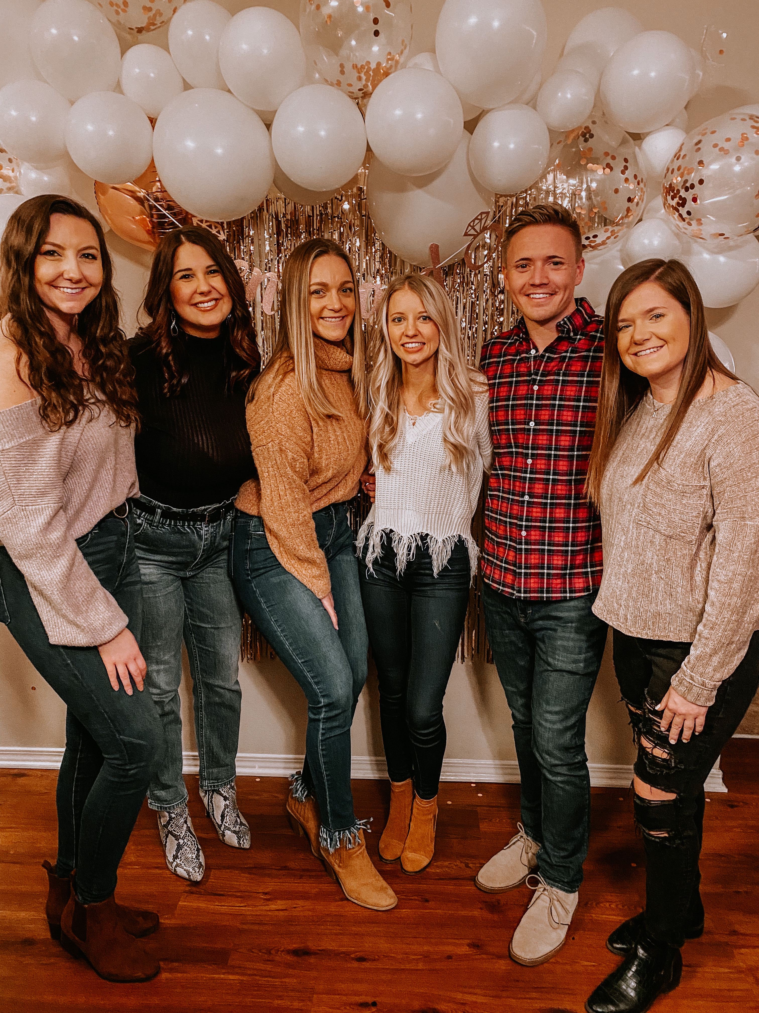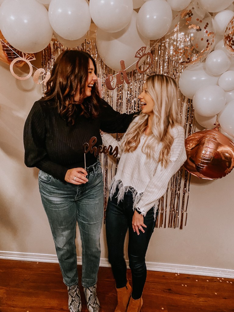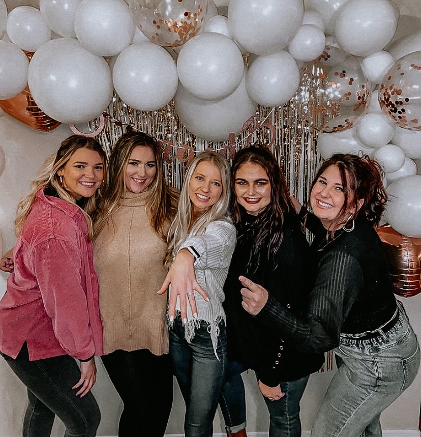 Right before the engagement happened I had told the bride I would take her to get a blowout when she visited. This way she wouldn’t be suspicious if I asked her after all the plans were in motion. She thought the blowout was a surprise for being engaged, but really it was a way to get her with me and distracted before the surprise. I went to her sister’s apartment at 1:30pm the day of the party to blow up the balloon arch and put up all the decorations. We also decided where the photo wall would be and where we would put gifts and snacks. I had to leave to pick up the bride for our hair appointments at 3:30pm. I arrived at her parents’ house where she was staying and helped her pick out a cute outfit that included a white sweater (bc bride obvi). The appointment took around an hour at DryBar Pittsburgh and we were looking glammed up. We headed to her sister’s to “give her a ride to Coop DeVille” and I told her I couldn’t hold it and had to go to the bathroom at her apartment. I played dumb on which apartment number it was because I was supposed to have never been there before. We were ready to walk through the door at 5:15pm. We had her open the door first and everyone shouted surprise and she burst into tears! She said it was so emotionally overwhelming to not only be surprised, but to have her family and friends together to celebrate when she hadn’t seen us all together since before COVID.