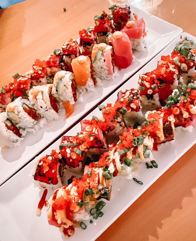 My Food Choice: I opted for two rolls when visiting. I got the Crazy Mermaid and the Rainbow Mermaid. I love sushi topped with fresh fish so the Rainbow Mermaid was perfect! I always love a spicy tuna roll as well so I decided on the Crazy Mermaid which has a spicy tuna base. My sushi is pictured on the top plate!