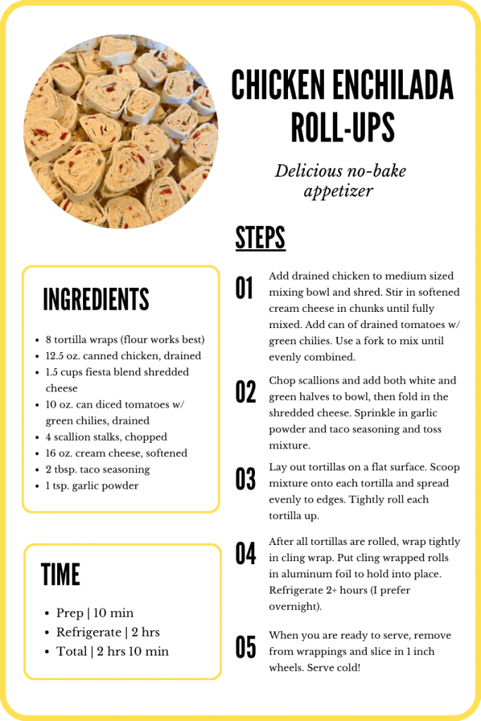 This fun and easy recipe was first introduced to me in college by my roommate, Lexie. Over the years I’ve made some changes to make it my own! There is no cooking involved in this recipe, which makes it super easy. It’s quick to prepare the night before an event. I tried making it with spinach tortillas to put a fun spin on the recipe for St. Paddy’s, but the wraps started to peel a bit. Flour tortillas work best in my experience. Recipe card at the bottom!
