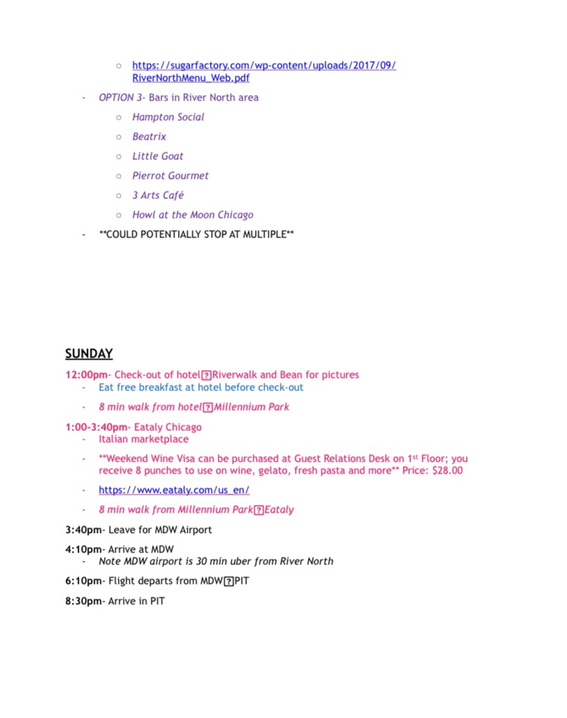 Mid-afternoon we headed to the airport and flew home to the Burgh. Our trip was wonderful and truly gave us an amazing look at the “Windy City.” When I plan trips people think I overdo it with the itinerary, but truthfully this city was so full of experiences that we needed an itinerary to fit it all in. My detailed itinerary is below if you’re interested when planning your trip!