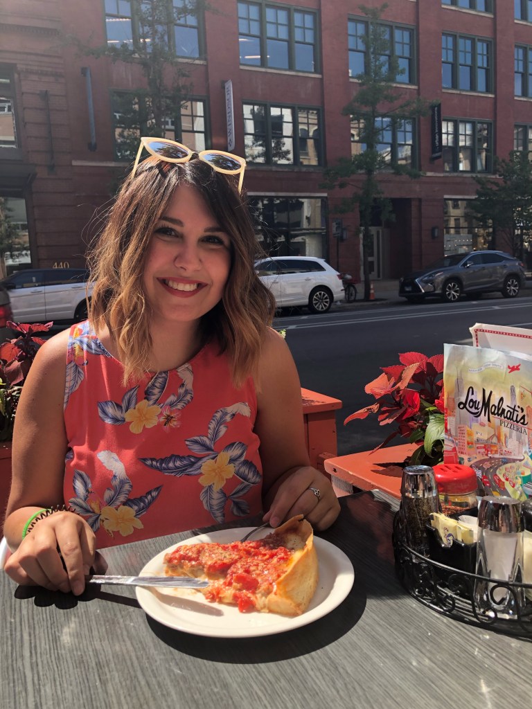 Myself along with three other ladies decided to take a long weekend getaway to Chicago during a weekend the Pirates would be playing at Wrigley field so we could get to see a game at Wrigley field. The dates ended up falling Friday-Sunday in July. We knew Chicago had so many fun attractions and we had tickets to the game so we wanted to maximize the fun with a jam packed itinerary! We arrived Friday afternoon and headed to the Chicago Famous Lou Malnati’s for some classic deep dish pizza. It is HEAVY so prepare yourself. We ordered the Malnati Chicago Classic and a salad, because like I said it’s HEAVY. Def a fork and knife meal but it was so yummy. I don’t recommend taking leftovers because it didn’t reheat well.