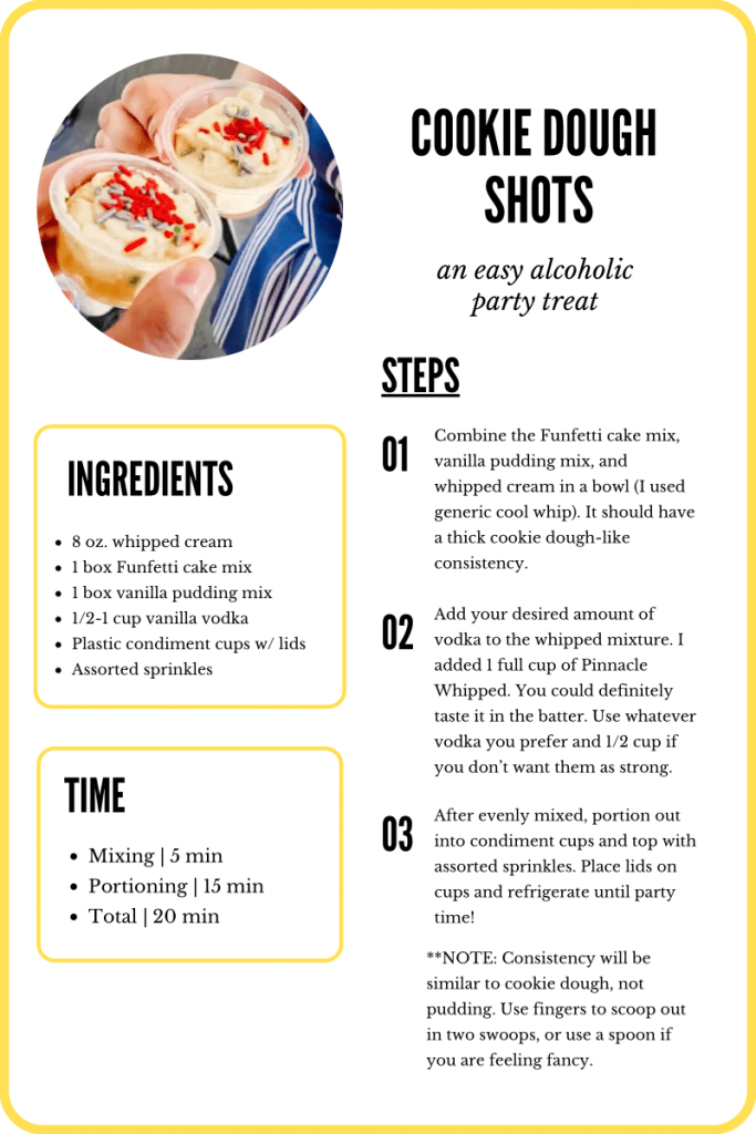 After receiving many messages about these cookie dough shots, I decided to write it out! I got this recipe from my friend Chelsea and it was a hit. Just be prepared that they are cookie dough inspired and not pudding inspired. Personalize them with festive sprinkles or your own favorite liquor! Recipe card below π