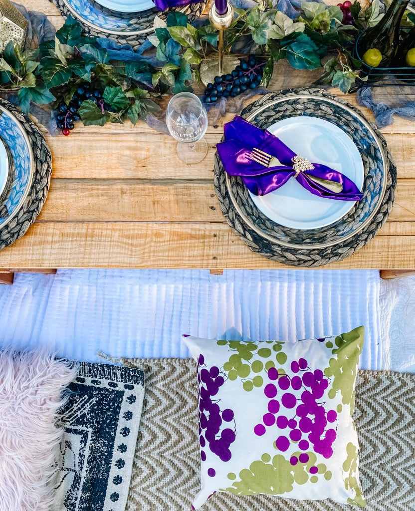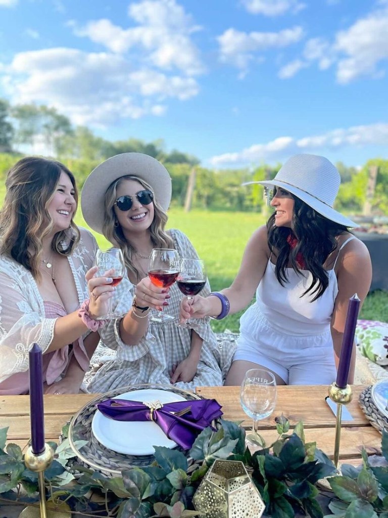 After the tour, we headed down to the table setup to enjoy a golden hour picnic. The stunning tablescape was wine themed and had every detail perfect. A branded wine glass will also be included for each guest to take home as a memory of the experience. You are able to purchase bottles of wine from the tasting room after your tasting of the 3 wines of your choice. These bottles can be enjoyed with your small bites or meal. You are able to upgrade your picnic by adding games, flowers, food, or even a private chef!