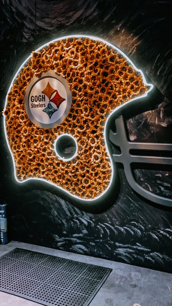After the session comes to an end, you are free to stay for another 25 minutes to check out the exhibit. This was awesome because I was able to snap some photos and videos as well as rewatch the experience with my full attention on the artwork and music. You can also stop over to the gift shop area in the entrance hall. One of my favorite parts of the experience was the Pittsburgh-specific artwork at the entrance. Being the city of bridges as well as the center of Steelers Nation, the exhibit captures the true essence of our small city through unique installations.