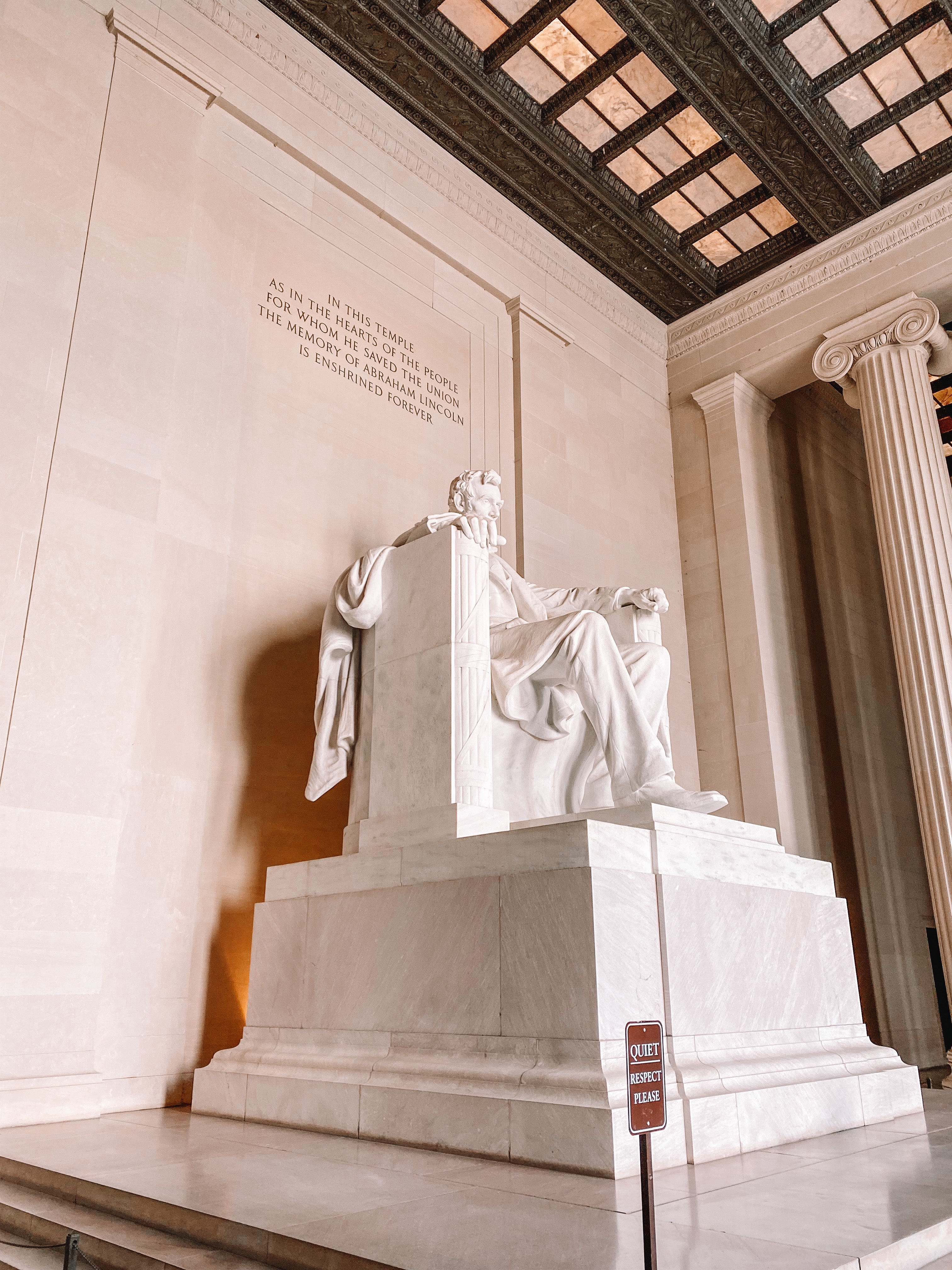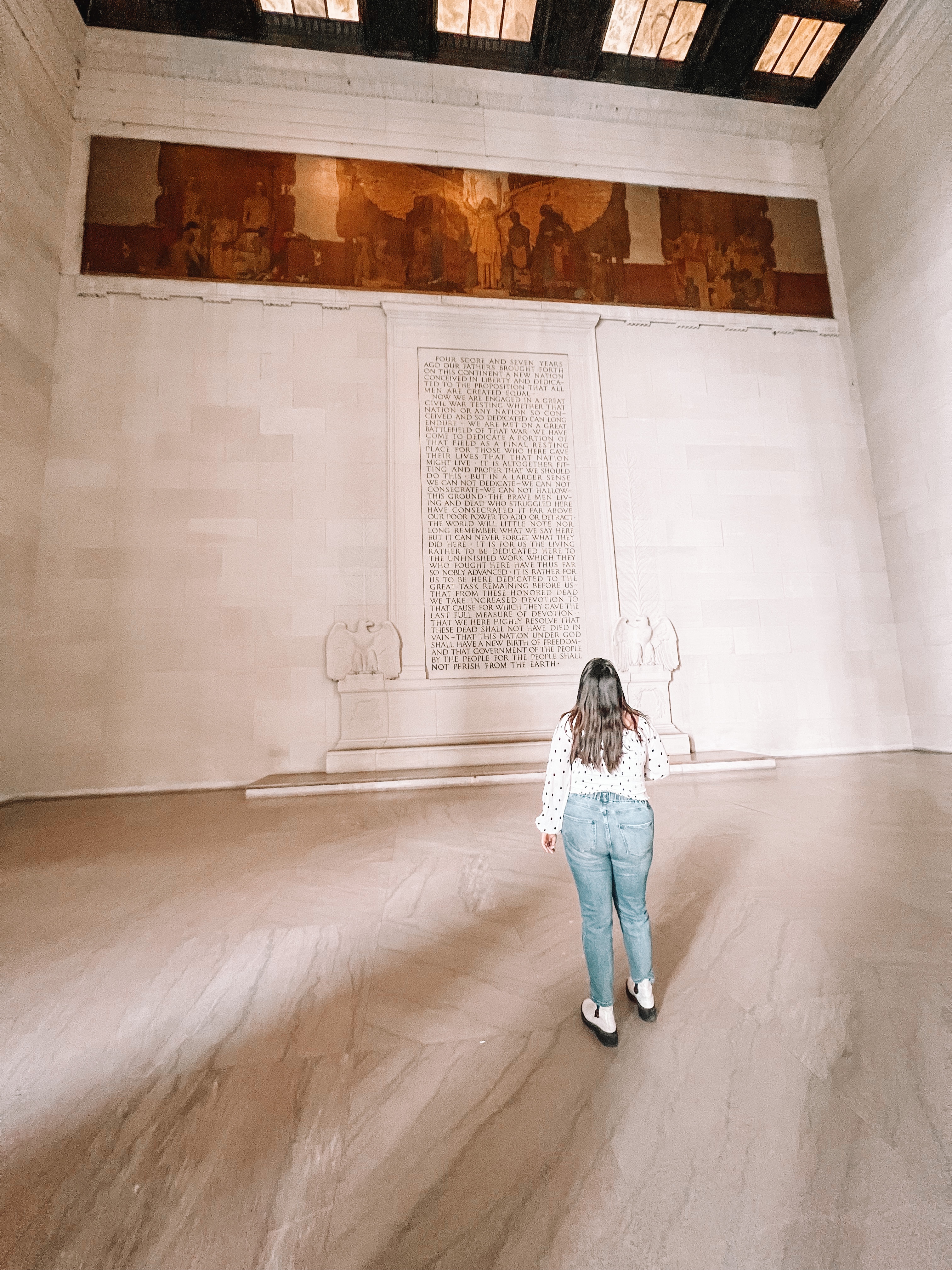 Now it was time for the NATIONAL MALL. Every time I hear someone say that I always think they are talking about shopping and have to remind myself the National Mall is the name of the walking path that connects all of the major monuments. Only a 13-minute walk from Kimpton Hotel Monaco DC, we headed to the Lincoln Memorial! This is by far my favorite monument. I don’t know what it is about the Lincoln Memorial that always draws me — the beautiful view of the Washington Monument in the reflecting pool? The Gettysburg Address etched into the wall when I used to have the first 2 paragraphs memorized? The fact that it was in iconic scenes in the show Scandal, Forrest Gump, and My Date With the President’s Daughter? The world may never know.