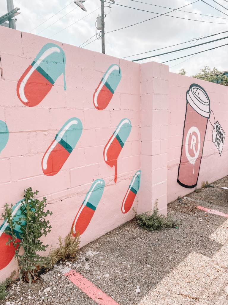 A classic picture for anyone visiting Austin, TX! This mural, like the Kendra Scott Flagship mural can be found in the South Congress neighborhood. About a 10-15 minute walk from the Kendra Scott mural, you can hit both of these murals in the same afternoon or evening. You’ll find this one on the side of a super cool store, Roadhouse Relics, which sells neon sign art created by Todd Sanders. Fun Fact: Sanders was the person who painted the Greetings From Austin mural! This mural has been around over 2 decades.