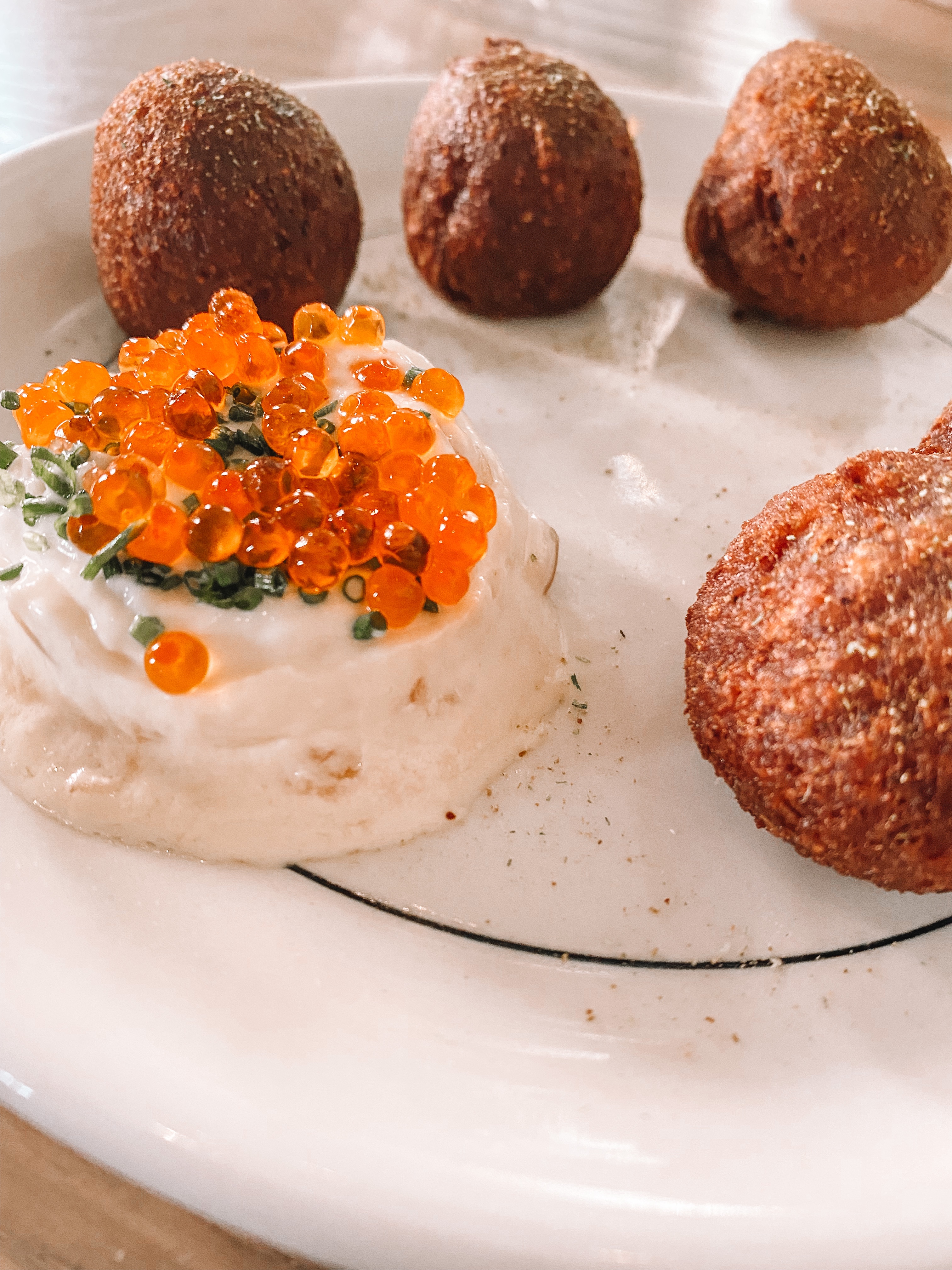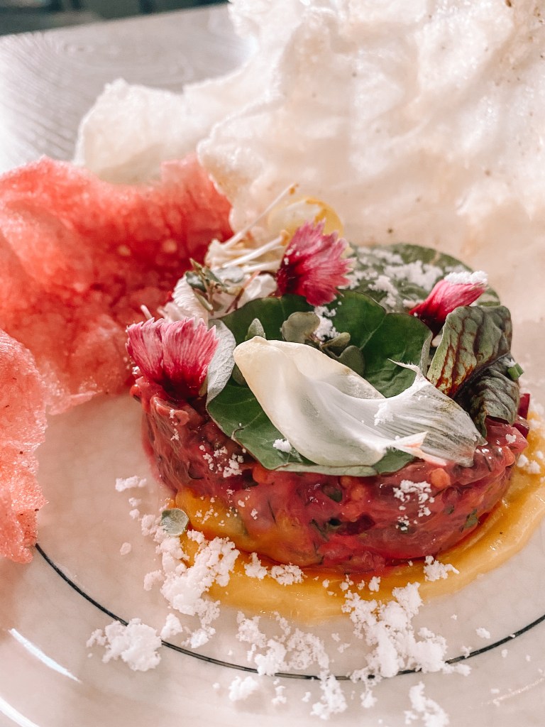 Olamaie, what can I say….how about best southern meal of my life?! This restaurant wasn’t on any of the blog posts or guides I looked at prior to visiting Austin, TX. When I arrived and met up with a foodie friend for drinks, her friend could not stop RAVING about Olamaie. He said this was an absolute must-visit. Thankfully we were able to squeeze in a weekend reservation since there were only 2 of us. For the atmosphere, think Bed & Breakfast. This restaurant is off the beaten path and looks like a residential home from the outside. When you step inside you feel almost a coastal, small town vibe. The way I suggest you dine at Olamaie is similar to a family-style dining experience, meaning you want to order several things and share so you can taste as much as possible. My friend and I started off with some cocktails. We asked the waitress to bring us something refreshing, but not too fruity, and with vodka at its base. They understood the assignment perfectly. After we took a look at the menu, we decided on the Beef Tartare and Hopi Blue Corn Hushpuppies for the first course.