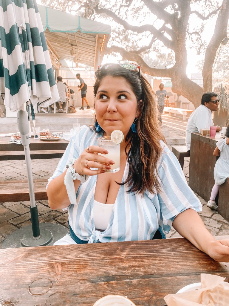 P6 is a very boho modern rooftop bar right on the water in Austin. Technically, P6 isn’t on Rainey, but it is a short walk or scooter ride to Rainey (we walked). This is one of the 3 bars/restaurants found within the Line Hotel. You are going to want to make reservations here because the seating is limited. The space is so beautiful with a great view, so on weekends you might not even get in without a reservation. We went here because it has a great vantage point for the “bat flight” from the South Congress Bridge. One thing we found out after we arrived in Austin was that the bats don’t fly out every night, TRULY SHOCKING BUT IMPORTANT INFO!!!! The bartender at P6 told us that he hadn’t seen the bats in over 2 weeks HAHA. This is why I would recommend P6 for the “bat flight” because even if the bats don’t fly that night, you’ll have some cocktails to sip on while you watch the sunset! I went with the Wild Side Cocktail which has a base liquor of sotol. I had never heard of sotol before, so the way the bartender described it to me was it is the “earthy tequila cousin to the smokey mezcal” which was spot on!