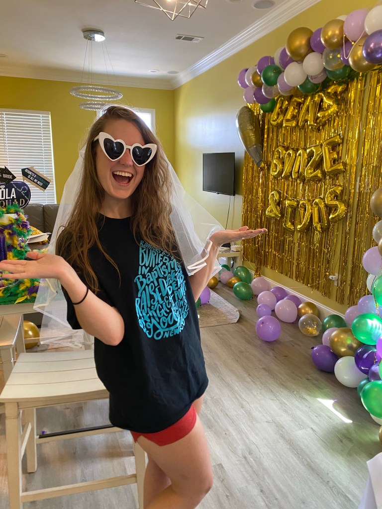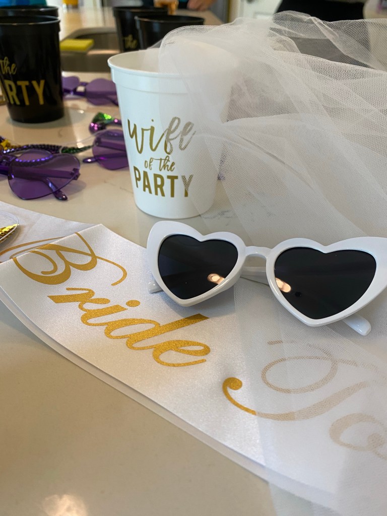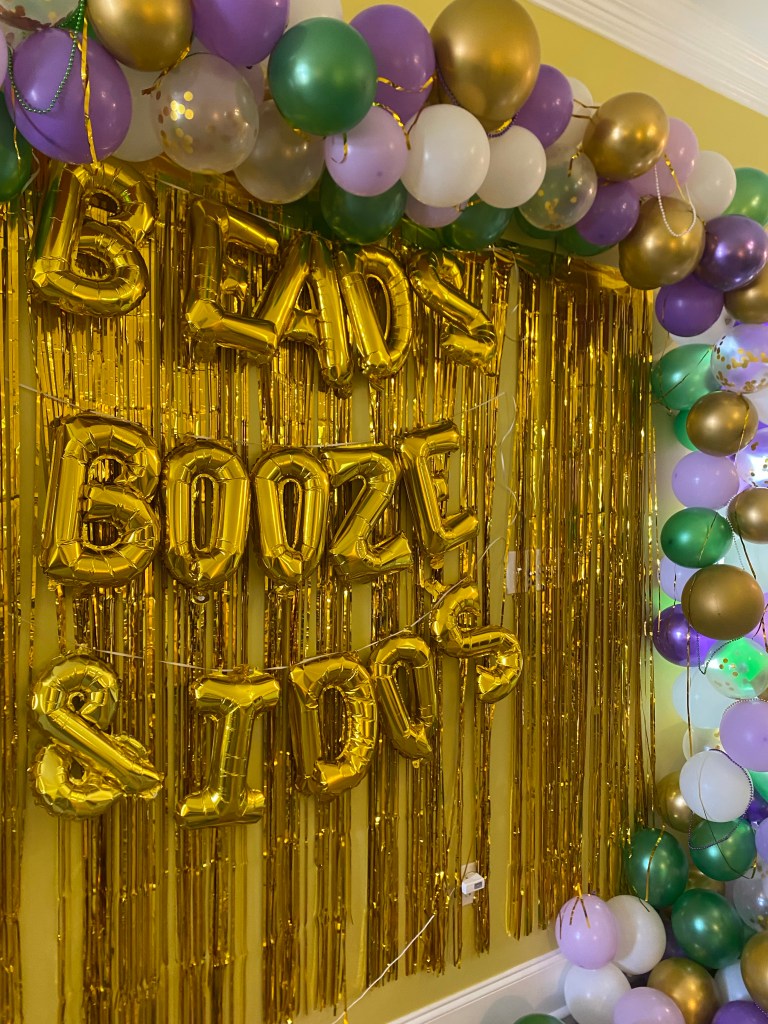 We sent the bride to her room to shower and freshen up while we decorated for the Mardi Gras themed Bach (all Mardi Gras Bach decor linked on my LTK.it). She loved everything & even added some of her own goodies like the recovery kits for each gal in attendance.