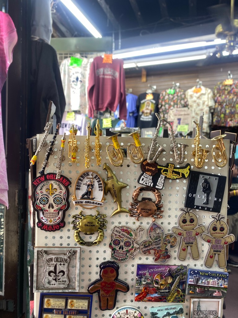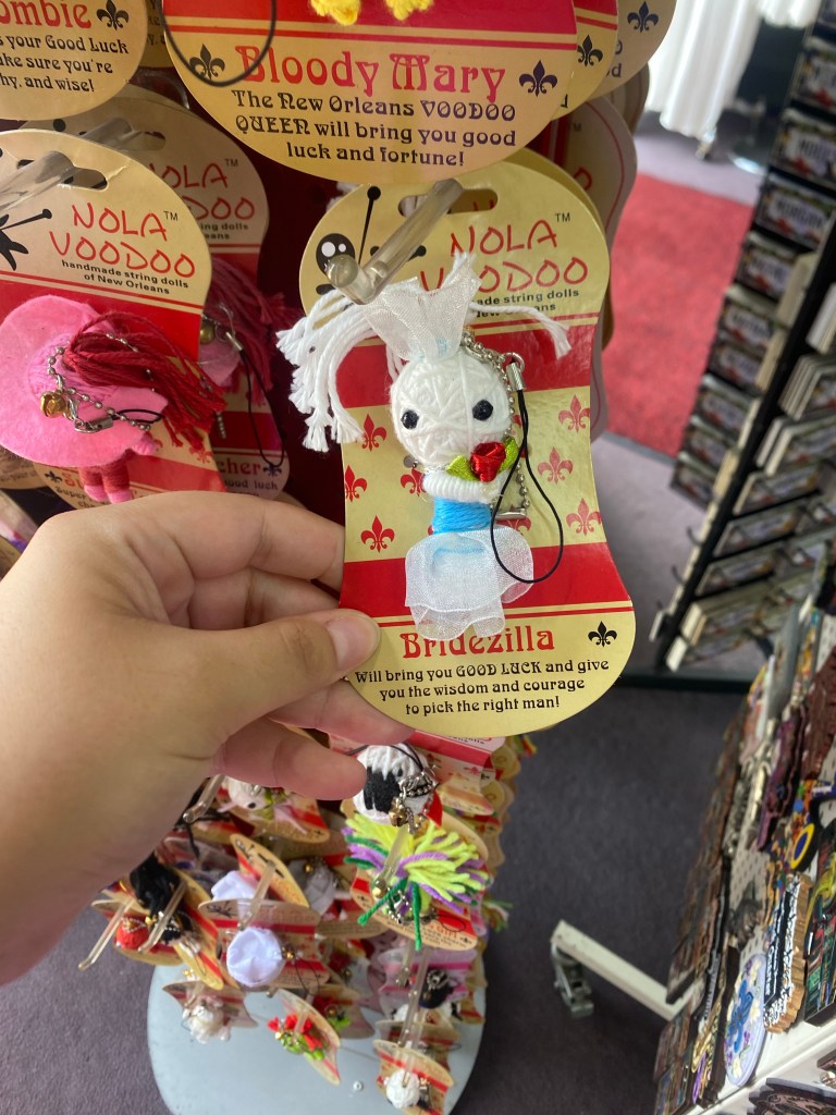 As we continued to peruse the antique & gift shops, we found cute trinkets & eclectic gifts. I had to snag a photo of the little “bridezilla” voodoo doll I saw to show the bride (even though she was the furthest thing from a bridezilla). I also found the cutest little instrument magnets and as a 9-year clarinet player, 2-year tenor sax player & lover of miniature things, it was VERY hard to resist buying them all LOL. We did find some cute handheld sequin fans that came in handy during the hot day for only $3!
