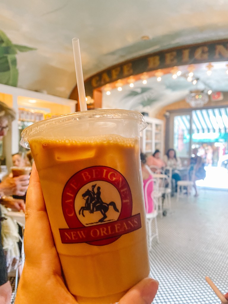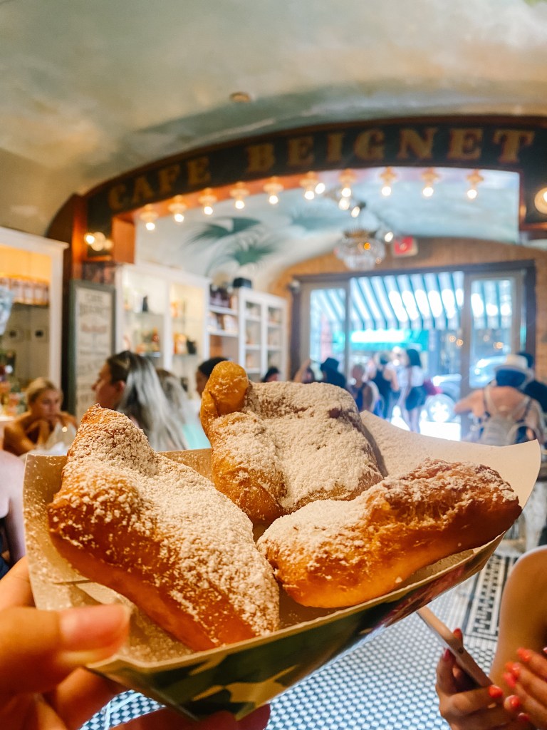 When we arrived at Canal Place, the gals split up & the crew that was passing on pole dancing headed out. We popped around to different shops, but I knew the true destination for our journey was Cafe Beignet. I mean after all, what is New Orleans without beignets?? Cafe Beignet was absolutely ADORABLE & gave off the cutest little European vibe. Despite being such a famous stop, they really had the line situation figured out at their original location (334 Royal Street). We went in, ordered, were given a number, found a table & were called when it was ready. Did I just eat a bagel & have a latte literally 2 hours before? Did I still order a trio of beignets & an iced caffe au lait? The answer to both of these questions is yes. The iced caffe au lait was a recommendation from my friend, Kate, who had been to NOLA before & it was perfect for beating the heat on our journey through the rest of the shops in the French Quarter.