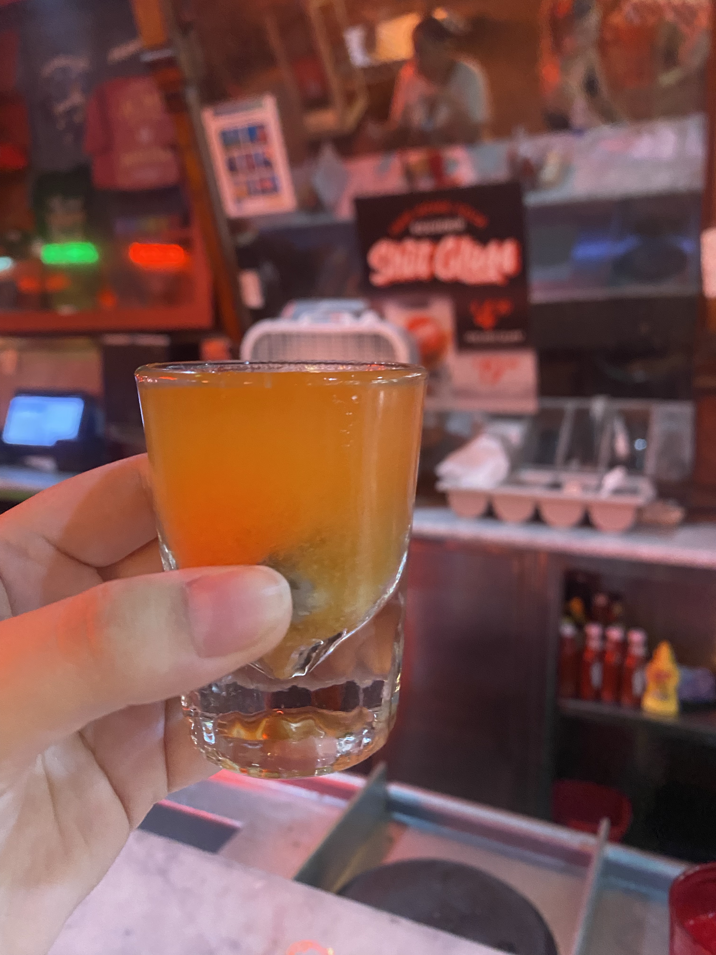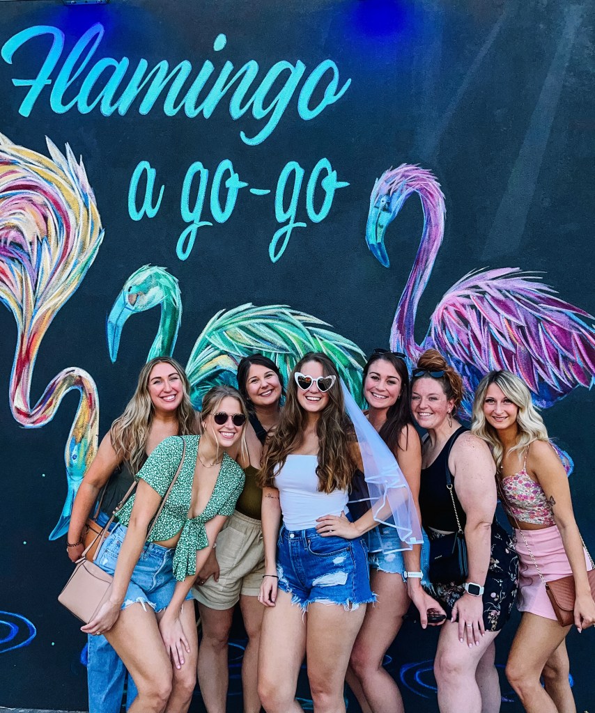 After having a few pre-drinks we headed to Flamingo A Go-Go for $3 drink specials & a bite. On Thursdays, Flamingo A Go-Go has $3 seltzers, wine, beer & frosé, so it was an easy choice to keep the buzz going. I ordered the jerk tacos with shrimp and they were the perfect bite to keep me fueled up. One downside here was there weren’t many vegetarian-friendly options. The big perk here was the cheap drinks! There is also a super cute mural outside for photo ops 😇 We finished at Flamingo A Go-Go and headed to our haunted tour!