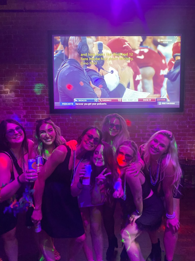 We mainly drank High Noons & vodka sodas throughout the night as we jumped from bar to bar. Other spots we hit along the way were Prohibition, Tin Roof, Hideout Bar, and my absolute FAVORITE, Razzoo! Notable details about each bar: Prohibition had a super interactive band which was so fun being there for a bachelorette party, plus they are the home of the HUGE A** BEER; Hideout Bar had an outdoor patio with corn hole where my friend & I lost to a pair of guys (one of which didn’t even know the rules…yikes on us); Razzoo had rap & hip hop tunes you don’t hear at most bars. Razzoo was no doubt my favorite bar of the night because I LOVE going to a bar where I can hear Lil Wayne, Waka Flocka & other throwback rap faves. After staying out arguably TOO long, we walked to Canal Street to grab an Uber, realized I had to go to the bathroom, was told at every place I had to buy something to use the bathroom, bought a wine slushy (😭), went to the bathroom & caught our Uber home. If you thought that was the end of our night, you would be wrong. Of course, we needed some late-night food so we got Rally’s burgers & fries while watching Bridesmaids (appropriately) on Netflix LOL.