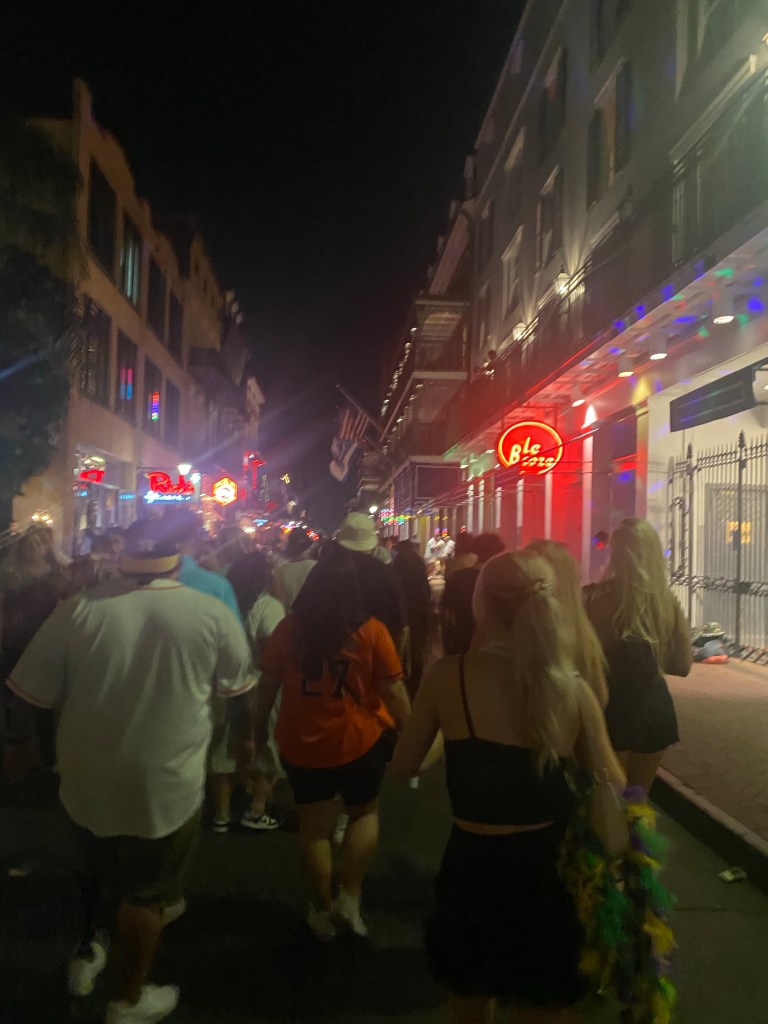 Around 4:30 pm, we decided our run at the Old Absinthe House should come to an end before we got too crazy. We were going to be headed right back to Bourbon to experience the nightlife after changing into our bachelorette attire! For Friday night out, we dressed in all black with feathered boas, beads, masks & purple sunglasses – a classic Mardi Gras vibe.