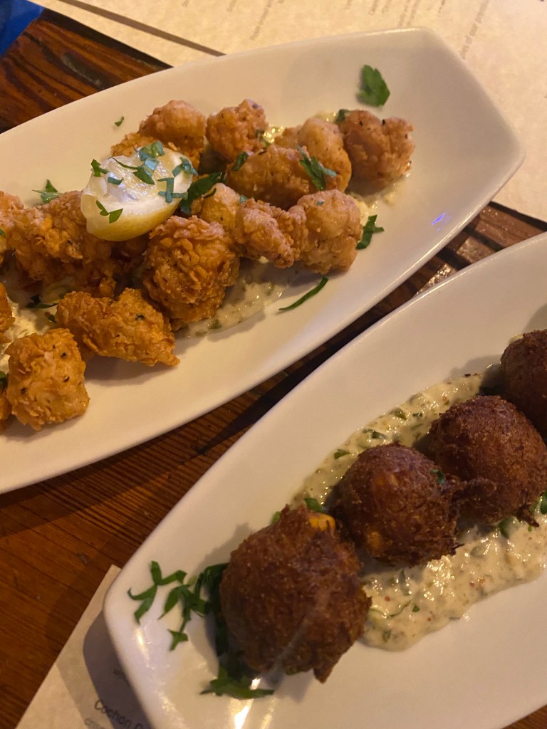 Our pool day came to a close & we went back to the AirBnB to change & freshen up for Saturday night. For dinner, we wanted a spot that had seafood options, but also vegetarian options & classic American options for our crew. We ended up deciding on Crescent City Brewhouse in the French Quarter. Crescent City Brewhouse has a solid variety of beers brewed in-house from their pilsner to their American IPA. They have beer flights available for 4, 5, or 6 samples of beer so you can try a few if beer is yo thang. For appetizers, the bride & I ordered fried alligator & crabmeat hushpuppies to split. Both were SOO yummy. The fried alligator came with white remoulade, house pickle relish & a lemon wedge while the crabmeat hushpuppies were made with Louisiana blue crab & accompanied by a white remoulade. For our mains, the bride ordered the shrimp & crawfish pasta – tagliatelle, Louisiana shrimp & crawfish, white wine cream sauce, fresh herbs, parmesan cheese & creole seasonings, and I ordered the crabmeat stuffed shrimp – jumbo shrimp, crabmeat stuffing, roasted summer vegetables & tomato beurre blanc. They were both soooo yummy as I’m a big seafood gal. To see the full Crescent City food & drink menu, click here. Crescent City also accepts reservations which is great for large parties!
