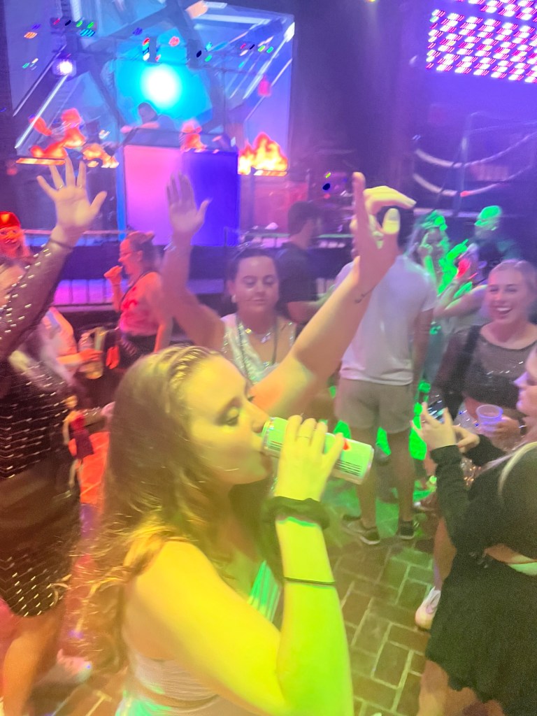 We had started the evening on a low note with the fail at the Carousel Bar, but things turned around QUICKLY when we arrived at Bourbon Street Drinkery! This bar was a frickin VIBE. Our bride, Dakota, absolutely loved this place. The music was AMAZING & perfect for dancing – think pop jams. The groom had Venmoed us for a round of shots so we headed to the top floor bar! You could see the view of Bourbon Street from the small balcony view, so after a few drinks here we headed out for bar hopping!