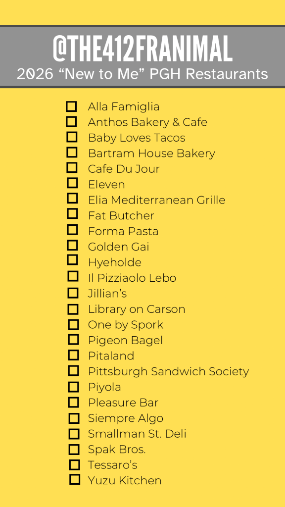 Anywho, here is my 2026 “new to me” restaurant list I’ll be working through! This idea is perfect for any time a friend wants to get together for a bite & we don’t have a specific place in mind. My list is a combo of fine dining & casual grab-and-go spots which I find to be great (especially for my wallet LOL). I haven’t been to any spots yet, but I do have a reservation set for Siempre Algo in February I cannot wait for! If you have any recommendations on must-try menu items, feel free to shoot me a message on instagram @the412franimal 😊