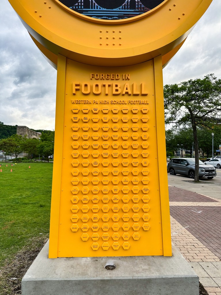 Installed in early 2025, the official NFL Draft countdown clock can be found on the North Shore across from Acrisure Stadium. This clock has been counting down the days, hours, minutes & seconds to the start of the NFL draft. This clock also is a nod to all of the neighborhoods that make up Pittsburgh & each school district that makes up Western PA’s football programs. Stop by the clock to find your neighborhood & school district! PS: It’s also a great photo op.